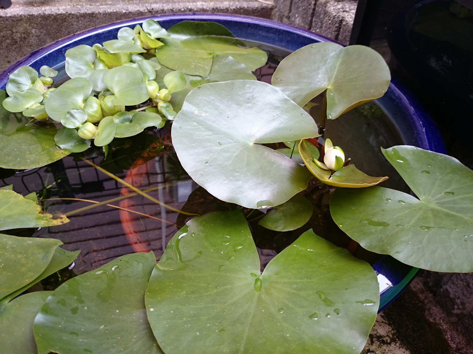 これは去年、どこぞの水辺に沈んでいたところから一株拝借してきたものになります。野生のものですので品種など一切不明、いわゆる「ヒツジグサ」というやつだと思います。思いのほか葉が大きくて鉢からはみ出しまくっていることに驚いていますが・・・いよいよ咲いてくれそうなのでホッとしています。