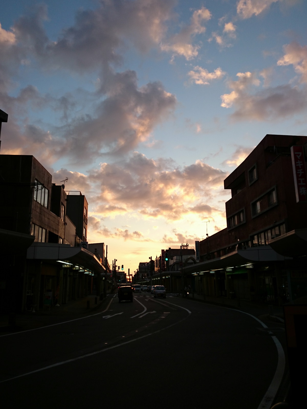 ちょうどいい角度、ちょうどいい焼け具合、建物がいい具合にシルエットになり、空の焼けた感じと残った青さがよい感じで混ざっていて・・・好きな色です。