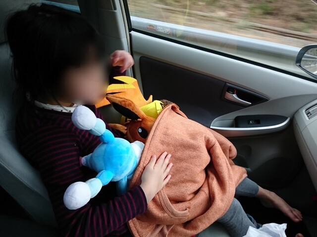 車に乗る時からゲットしたポケモンたちと触れ合いたくてうずうずしていた娘が、ご覧の通りポケモンを出して、わしのパーカーで包んで満足げな表情です(^^;。分かりづらいですが、写真の奥から「カプコケコ」、中央に「イーブイ」、手前に「オシャマリ」と並んでいます。