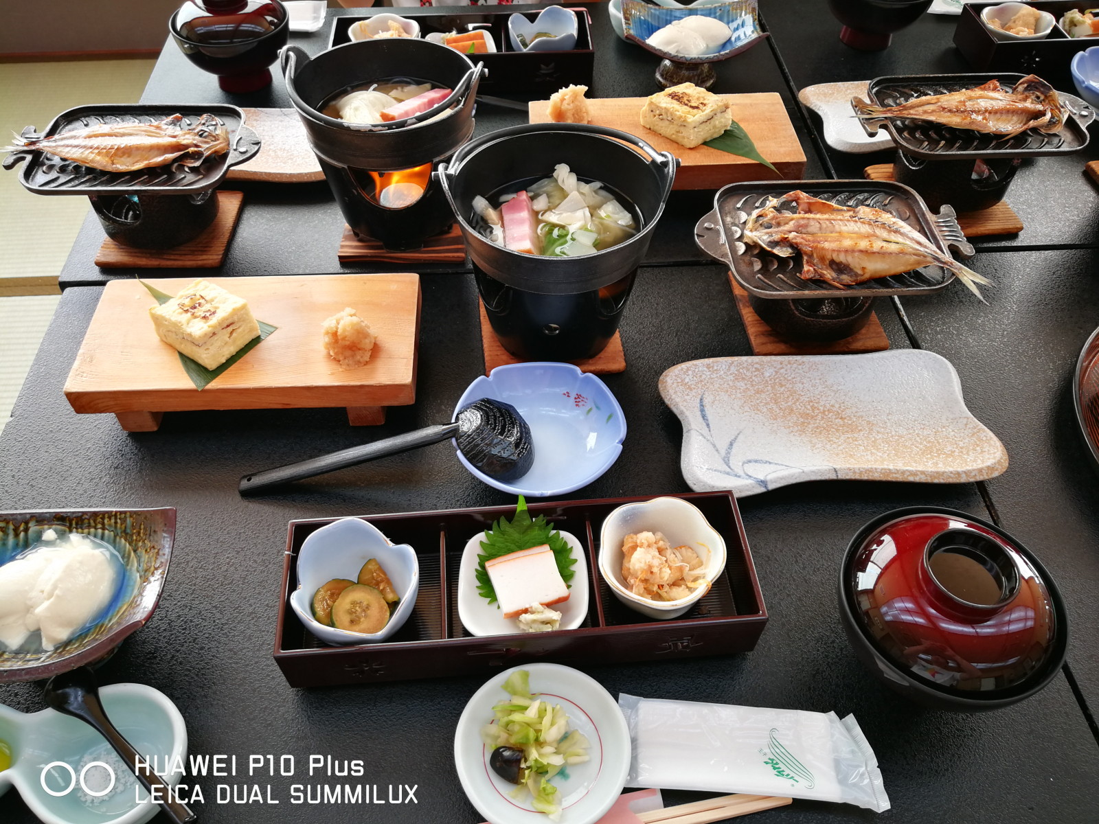 左下から、おぼろ豆腐、お宿自慢の卵焼き(めちゃうまい!!)、スープ?、アジの干物(めちゃうまい!!)、みそ汁。
