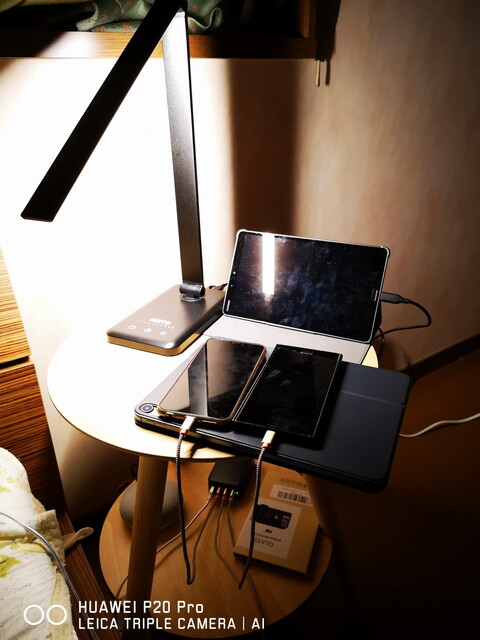 上の段はデスクライトと寝る前に動画を見たりするための8インチタブレット(Huawei Media Pad M5)を常設して、他は明日の朝までに充電されている機材たち。ここに読みかけの本も置いておける。