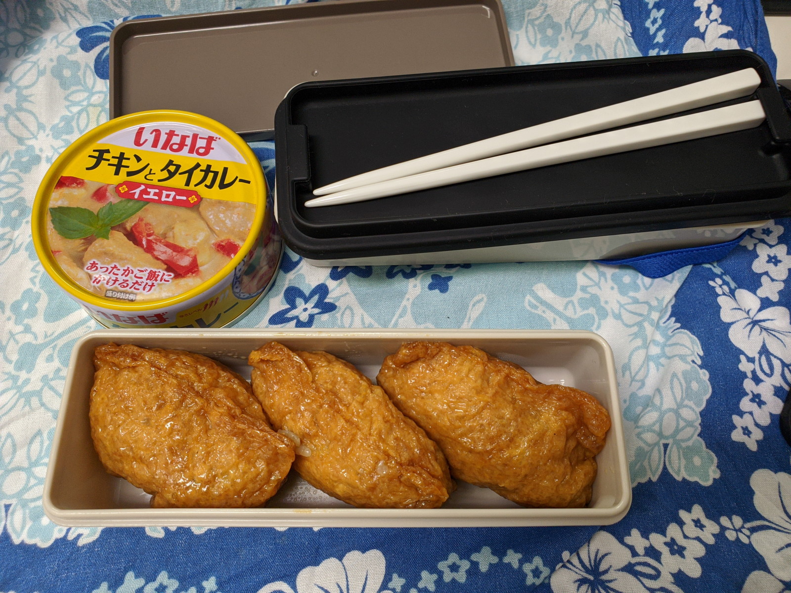 相棒が作ってくれたお稲荷さんになぜかいなばのチキンタイカレーの缶詰を買ってやがるな、わし。どうやって食べたんだろうか。一緒に食べてはいなかったことを信じたい。