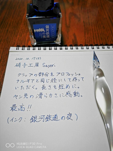早速書いてみましたが、超なめらか。感動の滑らかさ。ペン先が(私がもっているハリオのガラスペンと比べて)長めにできており、かつ捻りが入っていることも手伝って、一度インクを付けるだけでかなりの文字数を書くことができます。A4のノート1枚くらいならいけそう。わしは書くのが遅いのもあるので(インクにもよるものの)参考になれば。
