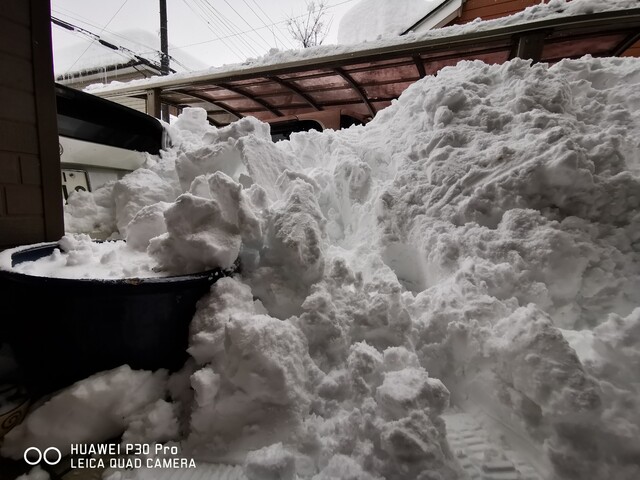 午前、相棒と娘が協力してカーポートに積もった雪をおろしてくれました。ただその結果がこれ・・・で、この雪をどうにかしないと家から出られません(^^;。
