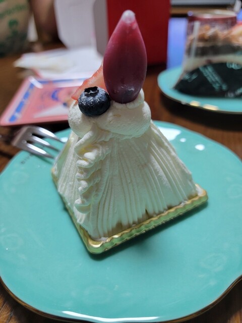 てっぺんに写っているこれ、何者かと思いますよねぇ。何か無機的な感じがして気持ち悪かったのですが、ケーキから取り外して下の部分についたクリームをなめてみたところ「ベリー系」の甘い味がしたのでわかりました。これ、ベリーソースが入っていたのですね。