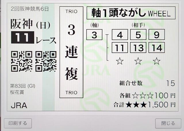 100円だけですが三連複ゲットです。3000円のプラス。幸先良い。
