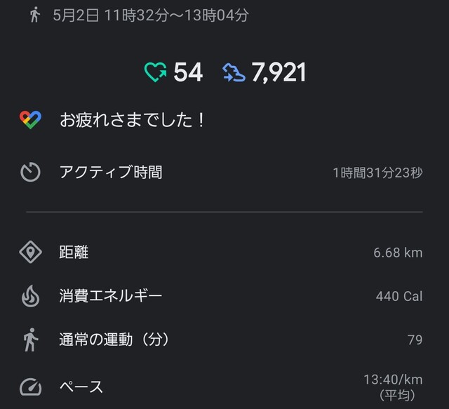天気も良く、後半はあちらこちらに出かけるし天気もあまり良くないようなので散歩Dayとしました。6.68km、7921歩であればまずまずかなと。夜はたっぷりねられそうです。