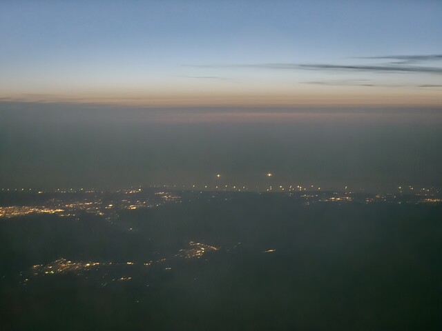 岐阜県、郡上八幡市上空。遠くに見えるのは福井県大野市あたりではなかろうかと思われます。右側の遠くに光2つの灯はなんでしょうか・・・やや不自然な場所に見えるので石川県小松の自衛隊基地の目印になる灯か何かでしょうか。快適なフライトを楽しんでおります。