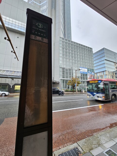 ホテルからバス停まで数分徒歩で移動。雨なのでホテルで傘を借りてきました。ここからはバスで目的地まで移動します。