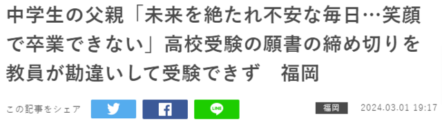 一方、Yahooニュースでのコメント欄を見ると願書を受け付けない高校側に対する非難の言葉もあるようですが、それは違うとも思います。高校側は正しくやるべきことをやっていた。これで(子供とそのご家族に非はないからと言って)特別に願書を受け付けます、と言ってしまってはルールがルールでなくなってしまう。厳しいかもしれませんが、ルールはルールで守らなければならないと思います。受付期日を過ぎていれば受け付けられません、と。それは仕方がない。