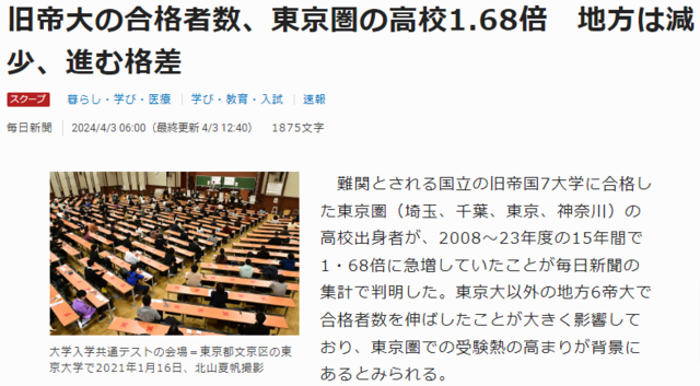 ということですね。仮にそのような環境にありながらも学力を身につけ、高校生になってから大学受験を意識するほどに至ったとしても・・・その地方の中ではある程度の立ち位置にいるほどに学力を高められていたとしても、大学受験となるとこの記事に書かれている通り都市部・首都圏の猛者と対峙することになるわけで、多くの場合はそこでジエンドですね。勝ち目はかなり薄い。