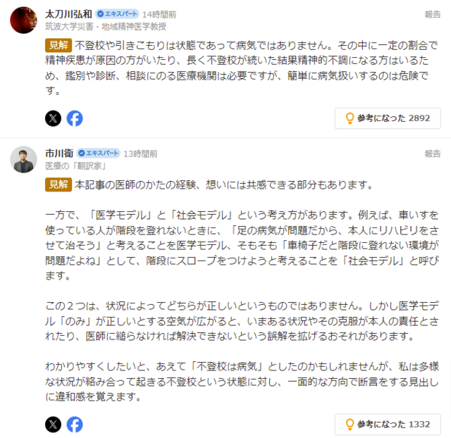 で、その記事に対して専門家が実名を出して寄せたコメントがこれ。「不登校の中に一定数の精神疾患がいるというのが正しい表現」というもの。この表現が一番しっくりくる。画像には無いが、専門家からは同様のコメントが続く。これは決して苦しい思いをしている人の思いをないがしろにしているのではなく「事実」・・・もしくは現時点で判明している「医学的見地でのアプローチの最大値」ということなのだろうと思う。精神疾患と診断されず、それでも苦しんでいる人がいるのが現状でしょうから、これが全ての答えとは言えないとは思いますが、医学的・科学的見地をないがしろにもできない。こういう話を耳にした悪知恵の働く人間は、「それなら不登校になってこの病院に行って病気と診断してもらえれば楽ができるんじゃないか」なんて考えて行動に移してしまうことがあるかもしれない。