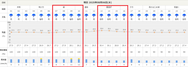 今日(2025年8月5日)から明日(8月6日)にかけての天気予報です。新潟県民にとっては長らく待ちわびた雨ですが、量は調整してもらいたいところですよねぇ。特に朝の出かけるタイミングの雨の量が半端ないですものね。