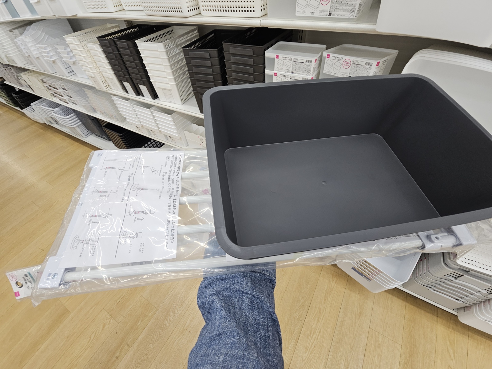 ダイソーで買い揃えました。突っ張り棚を購入、我が家のトイレの横幅とこの濃いグレーのボックスを横に2個並べるとちょうどトイレの幅になることが判明したのでボックス2個もセットで。