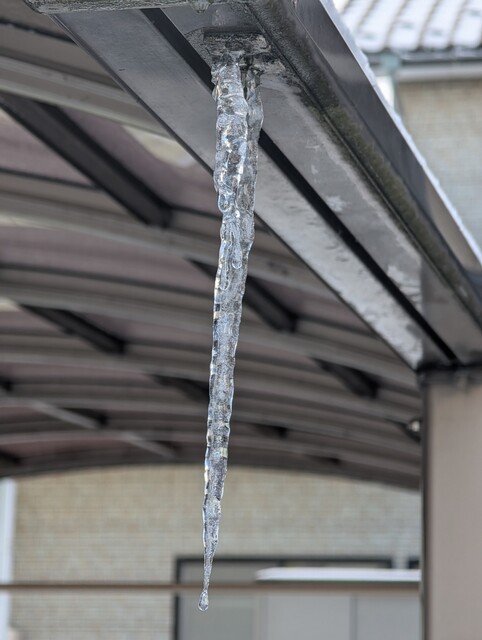 氷柱ですよ。こんなん見るまでもなく寒いのですが、目に入ると寒いことを改めて思い知らされますね。安全運転で行ってきます。