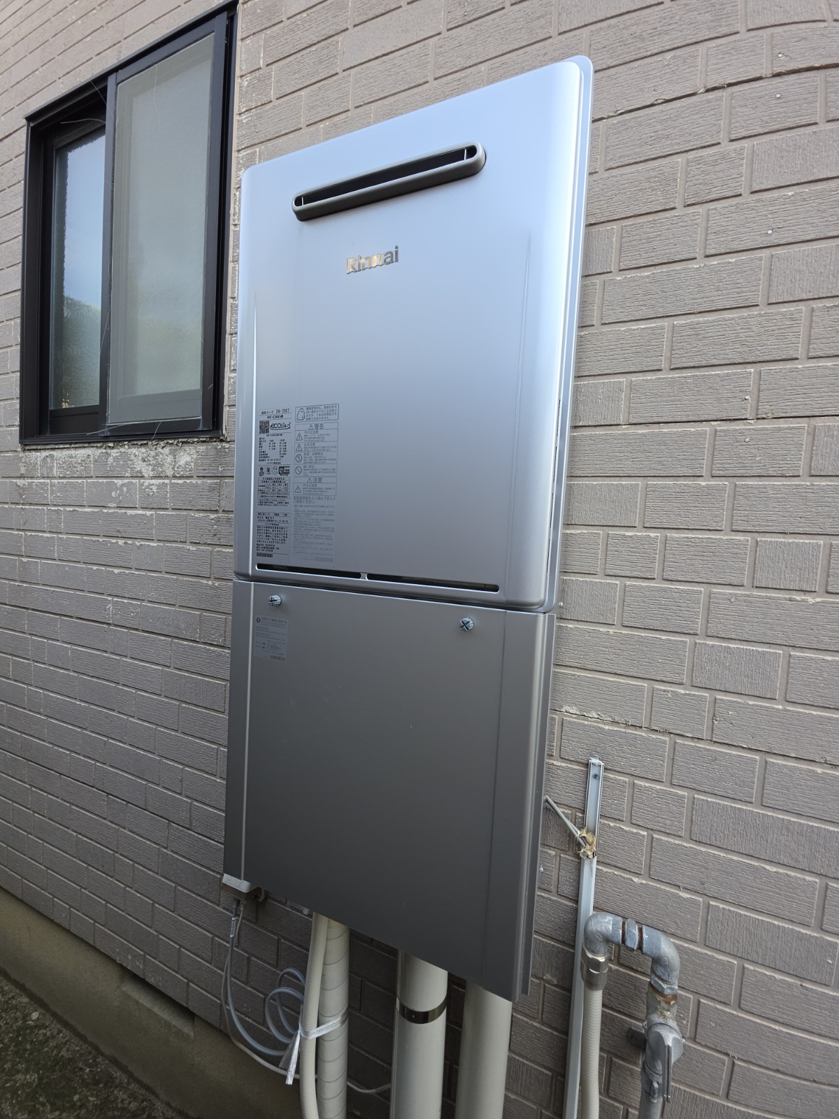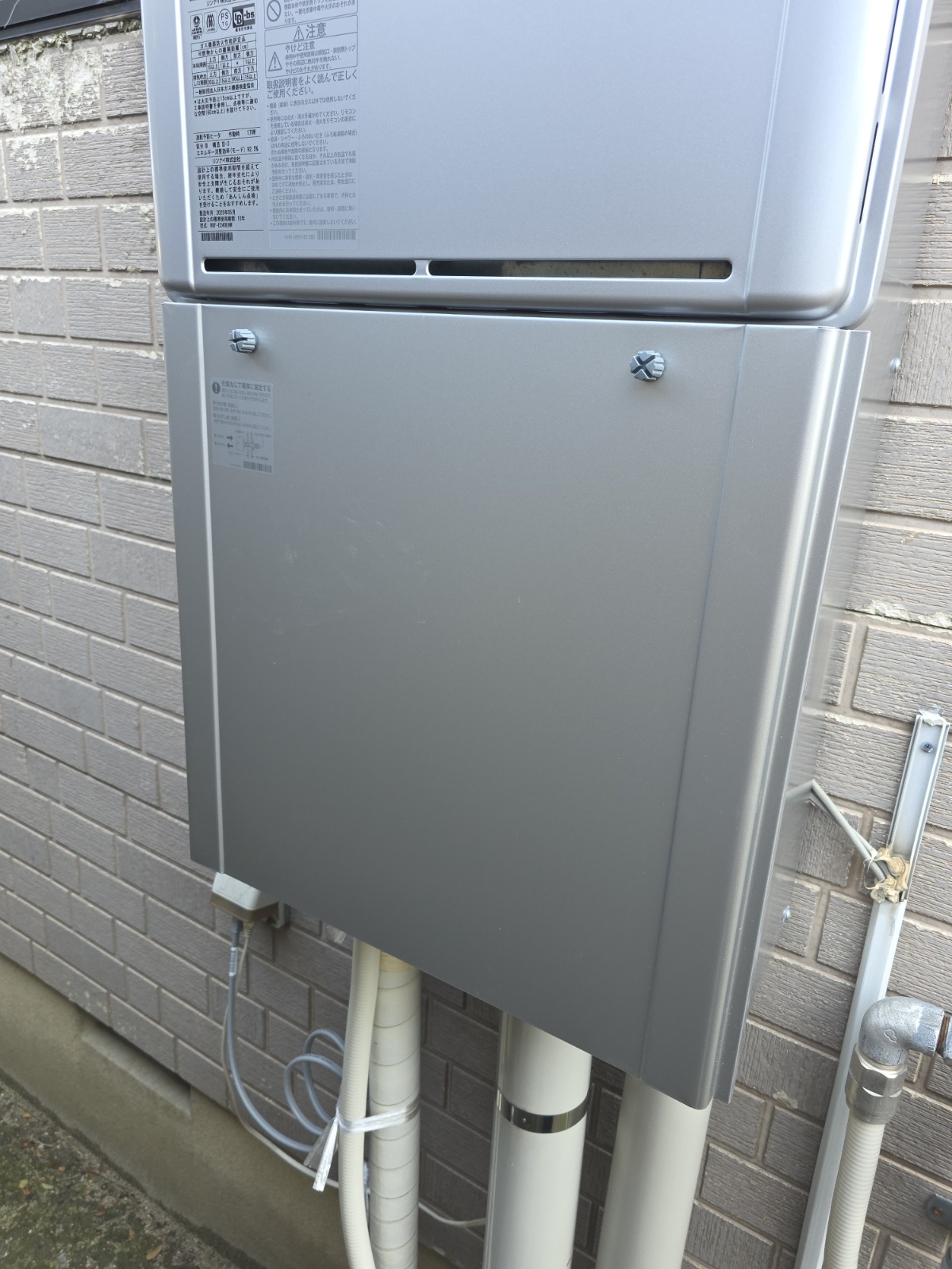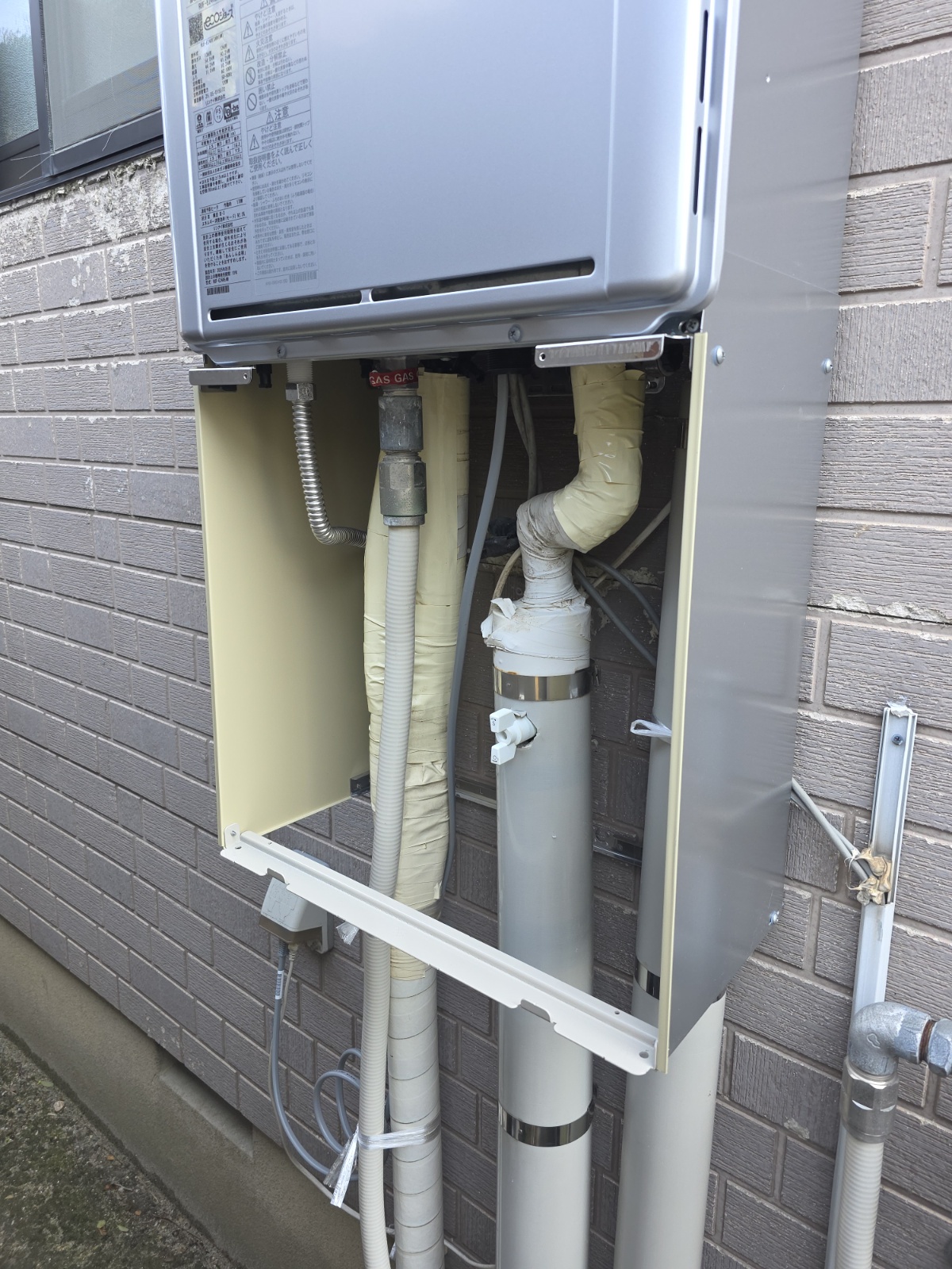 写真ではわかりませんが、下側が壁にしっかりと固定されています。アンコーも打ち込んであるので多少の風ではびくともしないと思いますが、経年で・・・とはいえ給湯器の寿命がくるか、壁の固定が弱まるかがいい勝負になるくらいは問題なくもつと思いますが、年に何回かとんでもない防風が吹くことがあるのでどうなるかはやや心配かな、と。