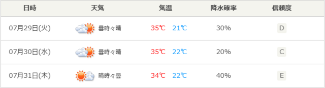 ということでイベント周辺の天気予報を見てみたのですが、まぁ暑いだけ・・・「だけ」では済まされないような暑さではありますが、雨が降ったりするよりはまし。熱中症の心配はありますがまずは現地までの移動だったりイベントそのものの心配はなさそうなので安心。しかし暑すぎますなぁ。体調に気を付けていきましょう!