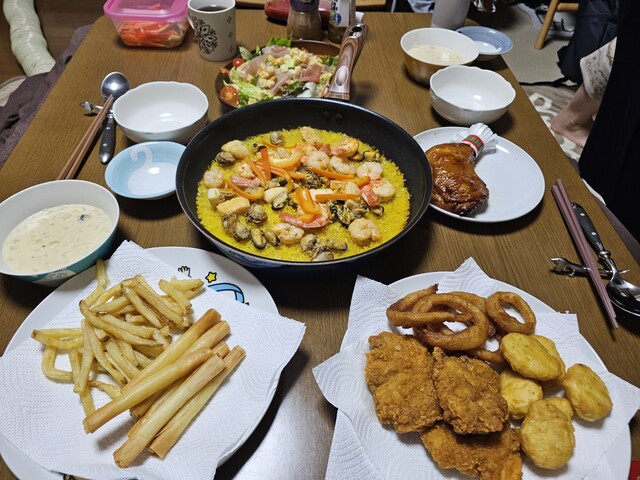 相棒頑張ってくれたなぁ。我々にとっては安定のいつものメニューなんだけれども、パエリアにクラムチャウダーに手間をかけて作ってくれてます。おかげさまでたっぷり食べるもんで&わしゃ食べるのが人一倍遅いもんで、結果それで相棒が洗いものをするのが遅くなって・・・というあく循環があるのでまた申し訳ないという・・・でもうまかったです。