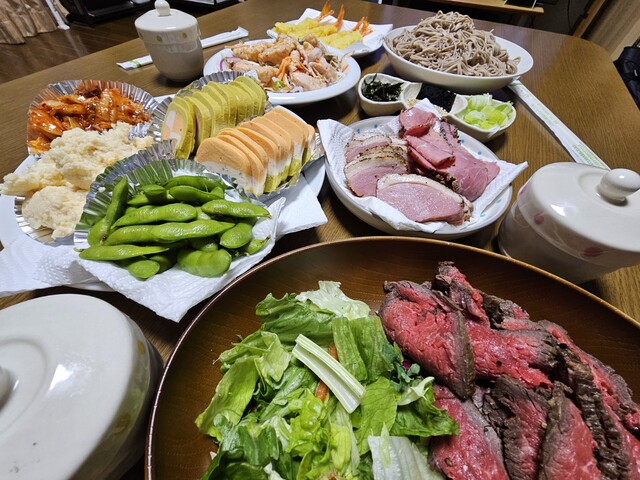 相棒が腕によりをかけて作ってくれた大晦日ディナー。ローストビーフを中心に豪勢な夕飯です。これを食べたらあとはまったりと紅白を見て過ごします。