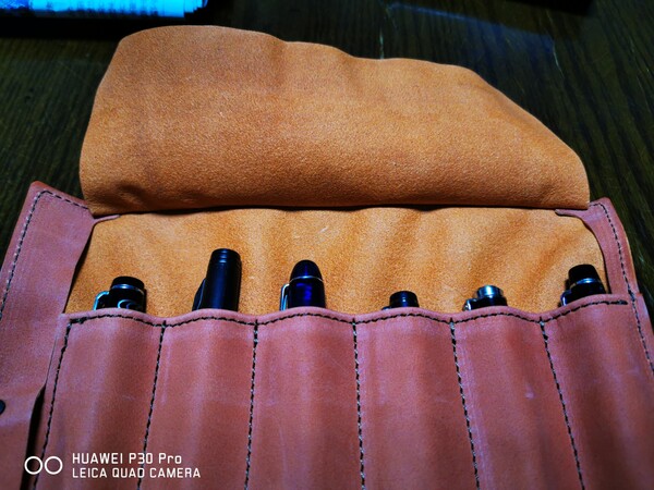 で、上部に着いているフラップをおろせば大切な万年筆をしっかりと守ってくれます。この状態でくるっと巻き込むと万年筆はちゃんと隠れて収納されることになります。